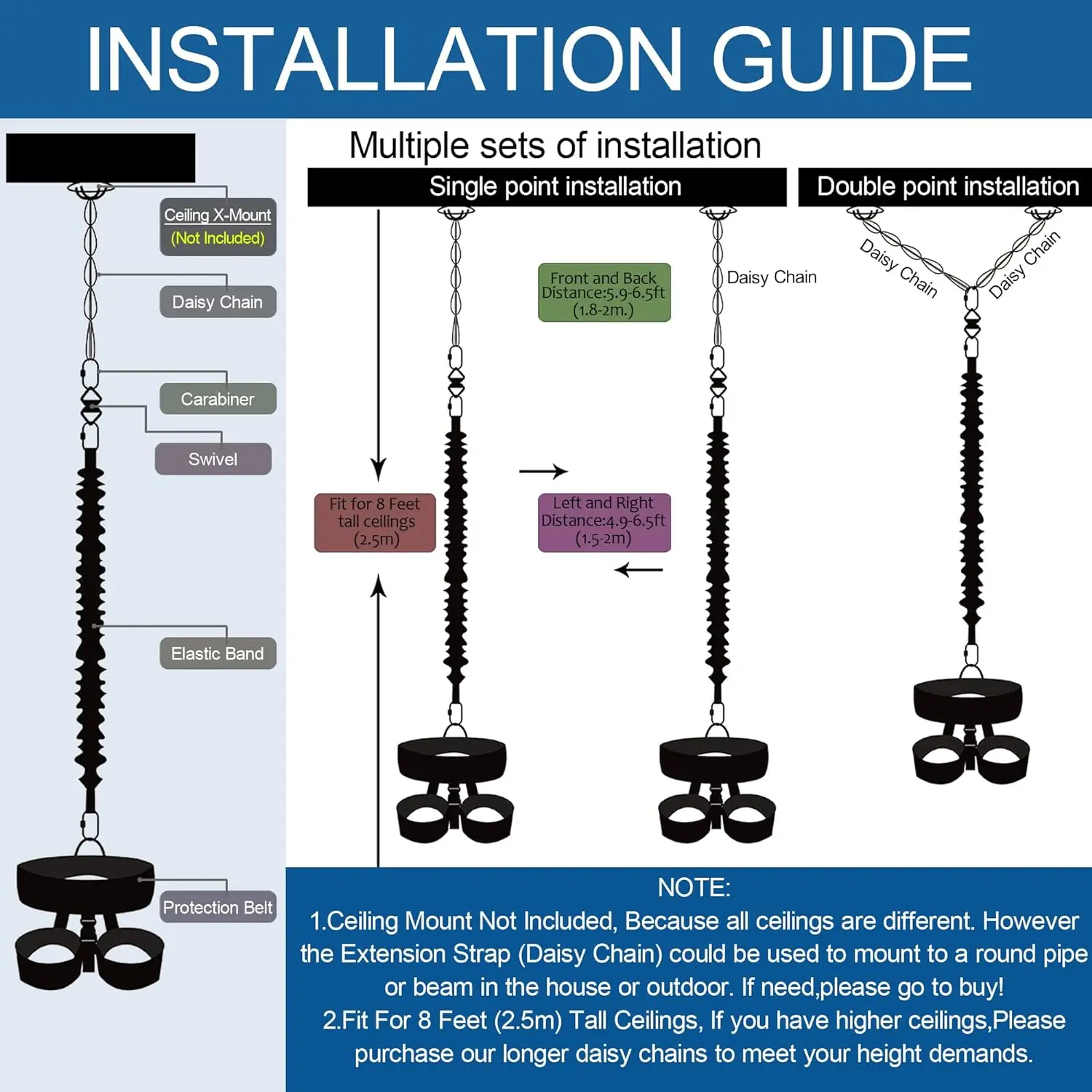 XS:88-110 pounds, S:110-132 pounds, M:132-154 pounds, L:154-176 pounds, XL:176-198 pounds, XXL:198-220 pounds. Bungee fitness is suitable for floors ranging from 2.5m-3.8m(8.2ft-12.5ft).